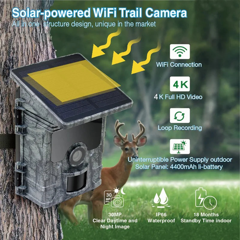 Full title: 4K 30MP Solar Panel Powered Hunting Camera WiFi APP Control Infrared Night Vision Outdoor Wildlife Trap Trail Camera Monitor