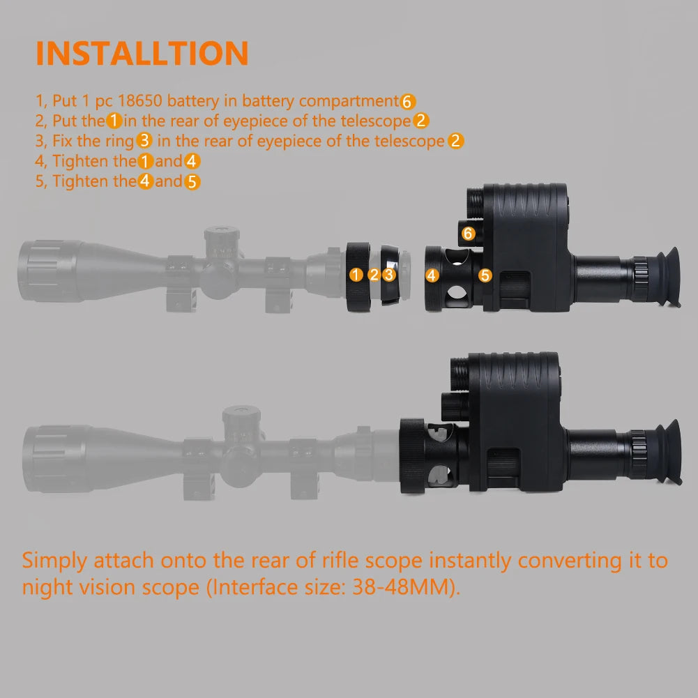 5, Easily converting your normal riflescope into night vision scope. (Interface size: 38-48mm).