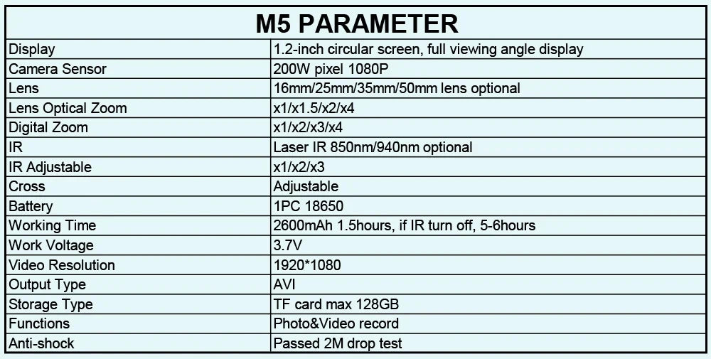 2, CLEAR VISION DAY AND NIGHT: M5 features 2MP FHD 1080P CMOS sensor, 50mm large objective lens, 4x magnification + 4x digital zoom, built-in 850nm laser IR illuminator with 3 gears IR levels adjustment enable to observe animals more than 3280ft/1000m at daytime, up to 1310 ft/400m in complete darkness, clearly at night. You can view full HD image directly on the large eyepiece.